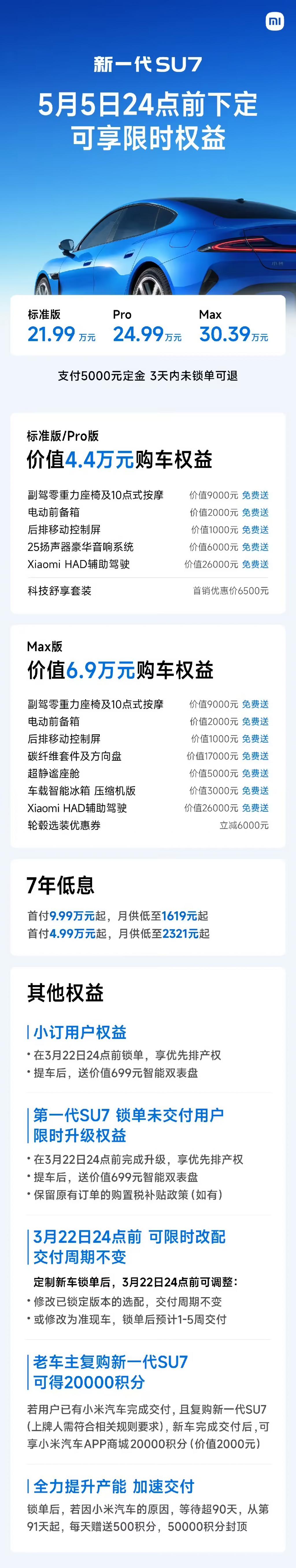 3 月 22 日 24 点前可限时改配,交付周期不变。小订用户、第一代 SU7 限时升级用户,锁单后可享优先排产权。