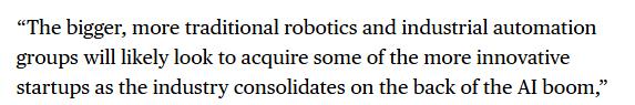 业内人士在文章中表示,随着行业的发展,投资逻辑可能会逐步从机器人本体及零部件,向其大脑、平台以及 " 该技术的物理 AI 层面 " 演进。" 随着人工智能热潮推动行业整合,规模更大、更传统的机器人及工业自动化集团,很可能会寻求收购一些更具创新性的初创公司。"
