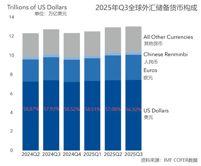 国际货币基金组织(IMF)汇总的官方外汇储备货币构成(COFER)数据显示,截至 2025 年第三季度,全球外汇储备总额为 13 万亿美元,其中美元的占比为 56.92%,较前一季度的 57.08% 小幅下滑。