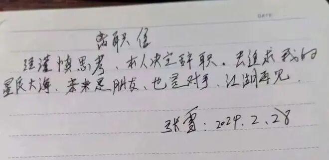 张雪在朋友圈晒出的辞职信