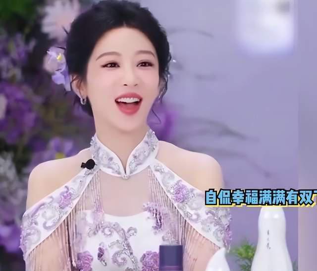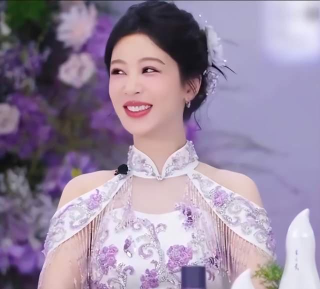 她的造型,与这份松弛自得的心境完美呼应。那身紫色旗袍,立领盘扣、钉珠刺绣,是东方的含蓄与矜贵;而流苏肩袖与鱼尾裙摆,则于静雅中暗藏灵动,仿佛她本人,既有古典框架下的优雅沉淀,又不失鲜活的生命力与摇曳风姿。这不仅是衣饰与身体的贴合,更是外在形象与内在状态的高度统一。整体造型优雅大气,完美勾勒其身材曲线,与她活泼温婉的气质相得益彰。