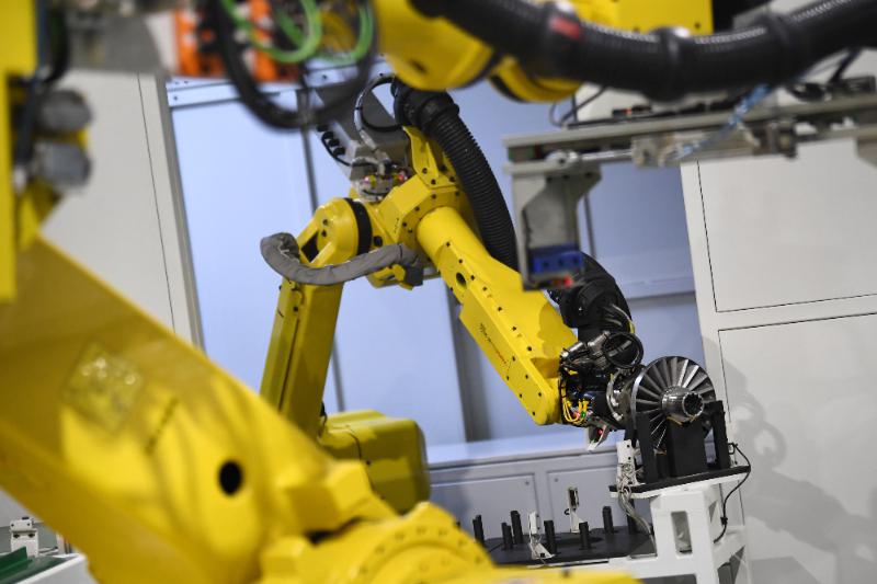 1 月 20 日,在位于咸阳市秦都区装备制造产业园的法士特智能制动公司,缓速器机加车间转子下料单元的机械臂在生产线上工作。新华社记者 李一博 摄