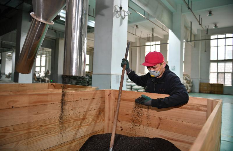 3 月 13 日,工人在泾渭茯茶智能化车间查看茶叶筛选情况。新华社记者 李一博 摄