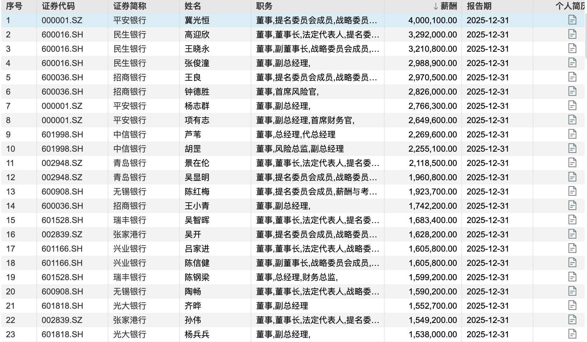 “百万薪酬”队伍中,还有民生银行董事长高迎欣,薪酬为329.2万元;民生银行副董事长、行长王晓永,薪酬为321.08万元;民生银行副行长张俊潼,薪酬为298.89万元;招商银行行长王良,薪酬为297.05万元;自2026年2月13日起上任邮储银行行长及执行董事的芦苇2025年在中信银行获得的薪酬为226.96万元。另外,城商行青岛银行(002948.SZ,03866.HK)董事长景在伦薪酬也达到200万水平,为211.85万元。