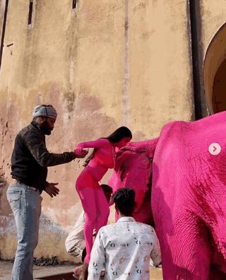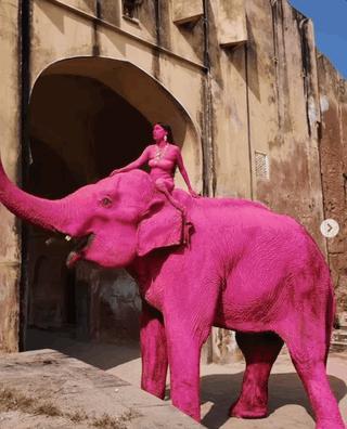 的确,如果真想要粉色的视觉效果,为啥不像印度当地人那样涂一点点粉色花纹,或者干脆把大象 P 成粉色,只让人类模特涂成粉色再来拍呢?