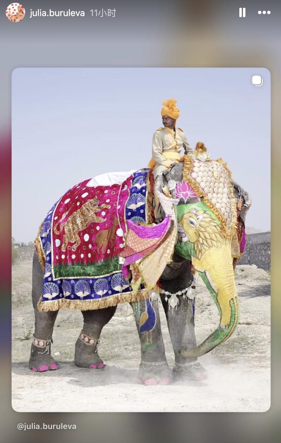 到这里,茱莉亚都没出啥差错。但拍摄途中路过城中古门,看到被饲养主牵着载客收钱,脸上涂了一些花纹的大象时,她灵机一动。