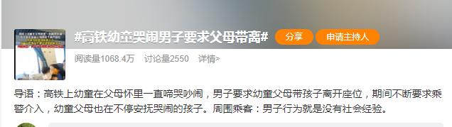 今年 2 月 26 日,# 高铁幼童哭闹男子要求父母带离 # 话题一度登上微博热搜,引发网友热议。