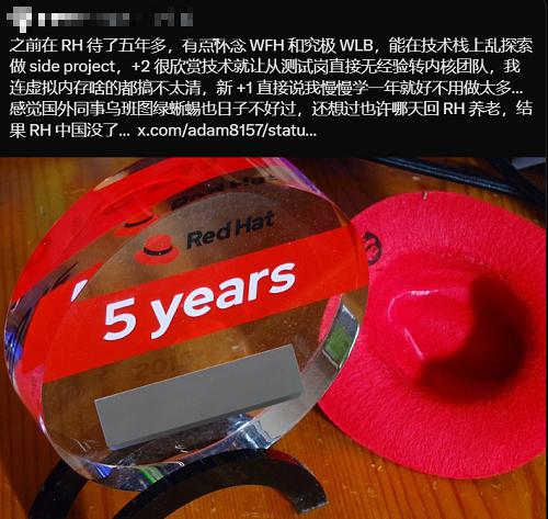 有位网友分享,自己曾在红帽呆了 5 年多,很怀念在家办公和工作 - 生活平衡的文化,他还曾想过哪天回到红帽养老,结果 RH 中国研发团队没了。