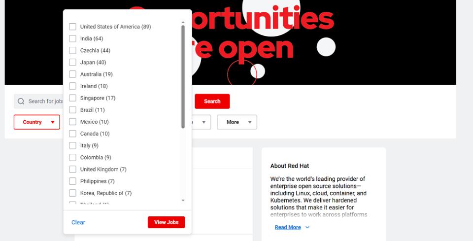 红帽的全球招聘官网显示,红帽目前除了在美国有较多招聘岗位之外,在印度、日本、澳大利亚、新加坡、韩国等国家和地区的岗位也不少。而在整个大中华区,只有中国香港仍有岗位正在招聘,所招聘的岗位是 AI 销售经理。