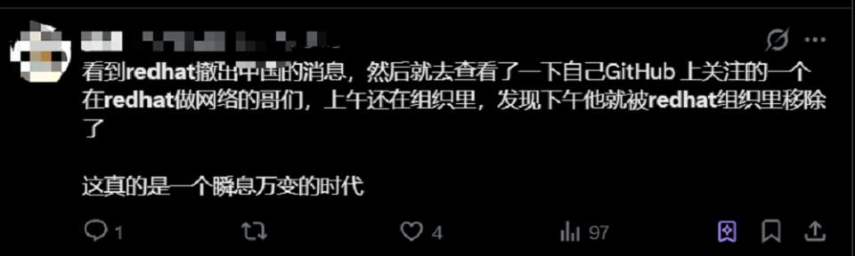 另一位网友分享,他在 GitHub 里常关注的一位在红帽做网络的员工,上午还在组织里,下午就已经被组织移除了," 这真是一个瞬息万变的时代 "。
