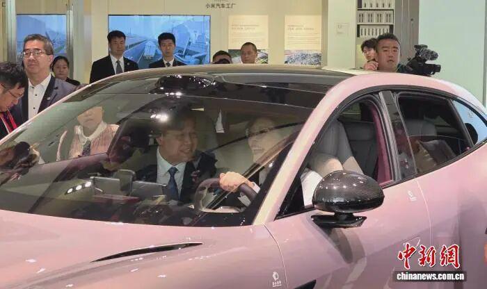 4 月 12 日,中国国民党主席郑丽文一行,在北京参观小米汽车工厂。郑丽文 ( 右 ) 受邀上车体验。中新社记者 路梅 摄