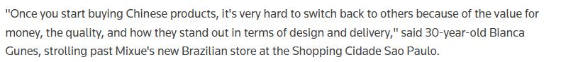 报道指出,近期,一家中国新式茶饮与冰品连锁品牌在巴西开设首店,标志着中国企业新一轮进入巴西市场的重心,已开始面向巴西这个拥有 2 亿多人口的庞大市场,直接布局消费端。路透社认为,这既是中企海外投资的新阶段,也反映出中国与巴西紧密的经济联系持续巩固夯实。