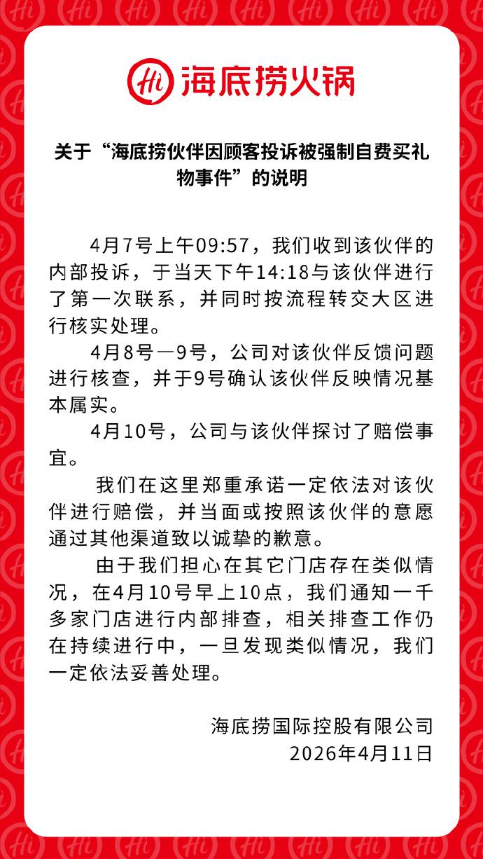 4 月 11 日,@海底捞火锅发布关于 " 海底捞伙伴因顾客投诉被强制自费买礼物事件 " 的说明: