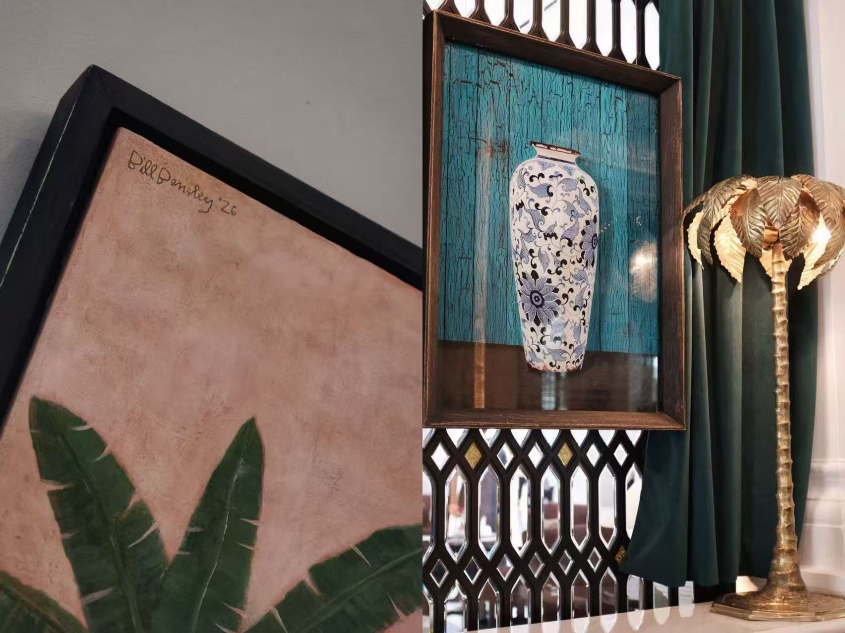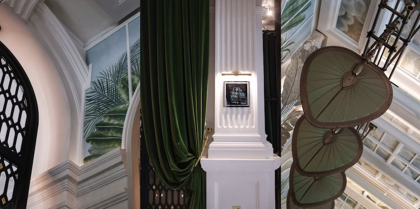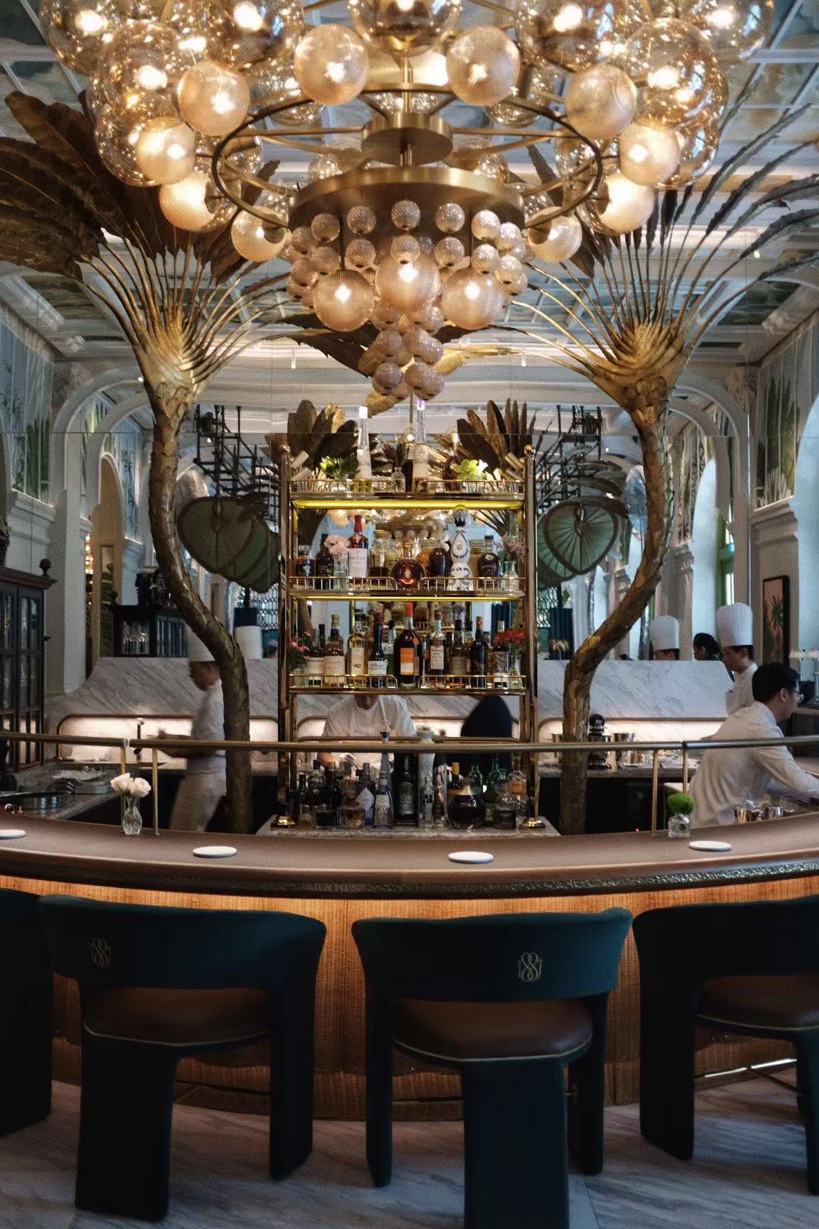 这种“重写”首先体现在空间本身。由Bill Bensley操刀的餐厅,从热带玻璃温室汲取灵感,同时呼应莱佛士极具辨识度的建筑风格:早期遗留的人字形木地板被完整保留,墙面手绘壁画、天花板上的棕榈意象、祖母绿色织物覆面的机械式朋卡扇、旅人蕉雕塑、古董陈设与传统银器,共同构成一种带有旧日东南亚优雅气息的正式用餐氛围。历史并没有被简单复制,而是被重新编排成一种今天依然成立的体验。