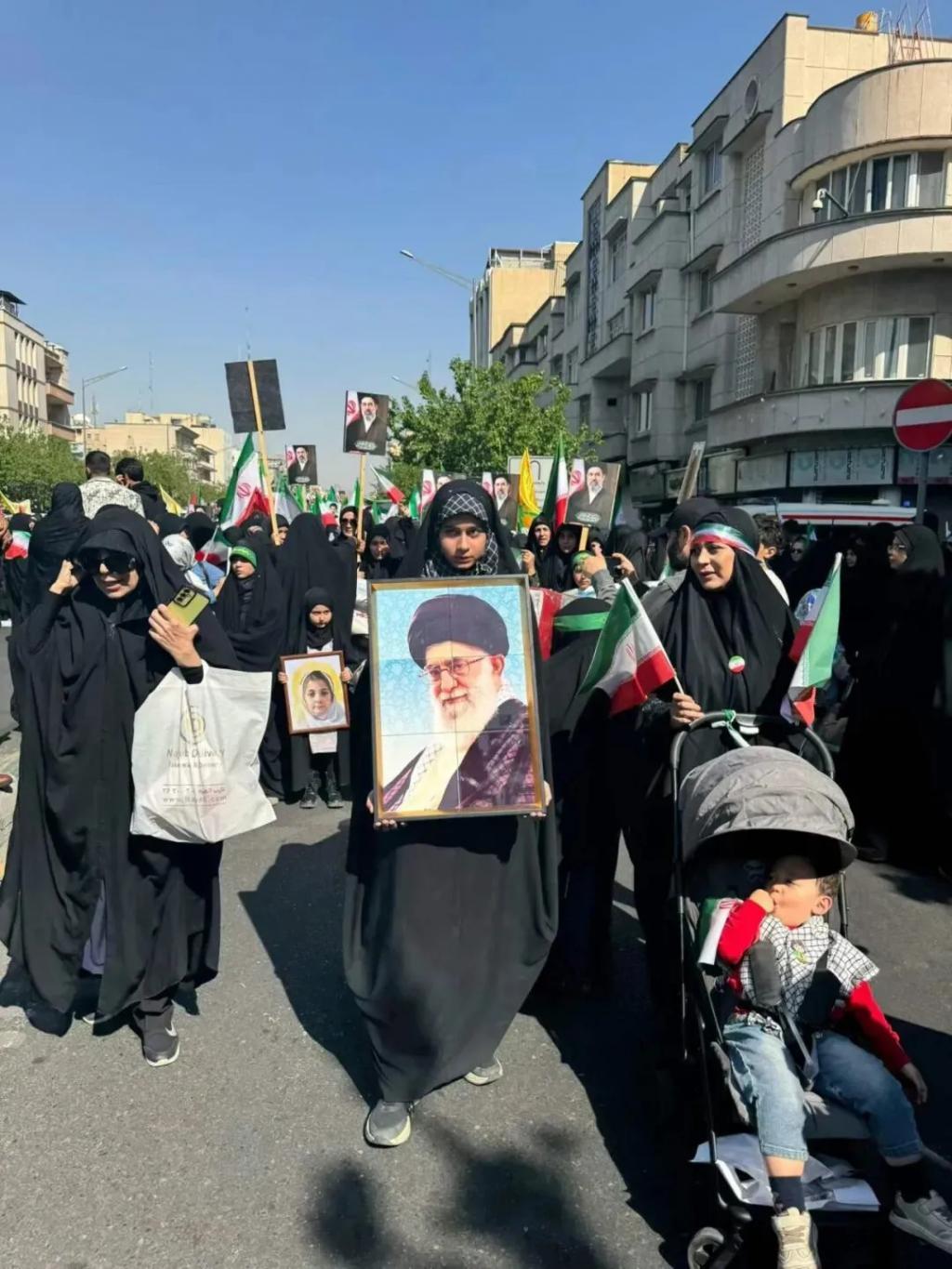 伊朗妈妈听完我说现场的情况,也很激动。她说,那根本不是真有什么意义,更像是做给人看的展示。最让她受不了的是,连抱着奶瓶、奶嘴的小婴儿都被推来了。她在电话那头忍不住发火,说这些妈妈带着孩子来干什么,战争真来了,这些小孩能干什么?去对敌人撒尿吗?她说看着那些裹在黑袍里、被抱着或推在婴儿车里的孩子,她心里特别难受,那么热、那么挤,孩子们说不定都要热出毛病、闹肚子了,回去以后还不是这些妈妈自己照顾。