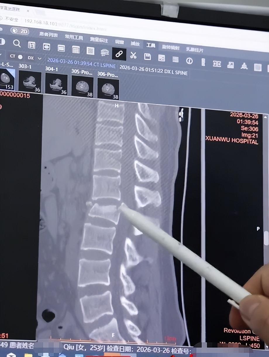王居勇进一步解释,小秋的腰椎骨头已被压塌,更危险的是,一块骨块向后移位,直接挤压进神经管,原本完整的神经管被挤得只剩约 1/3 宽度," 这很容易引发下肢功能异常,目前她已经出现肛门括约肌收缩无力、大小便控制不佳的症状,情况十分危急。"