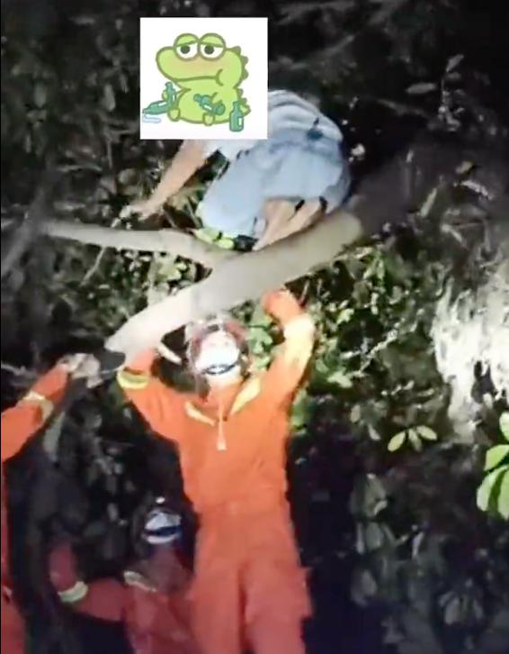 消防员爬上天花板跟男子沟通。图源:浙江消防