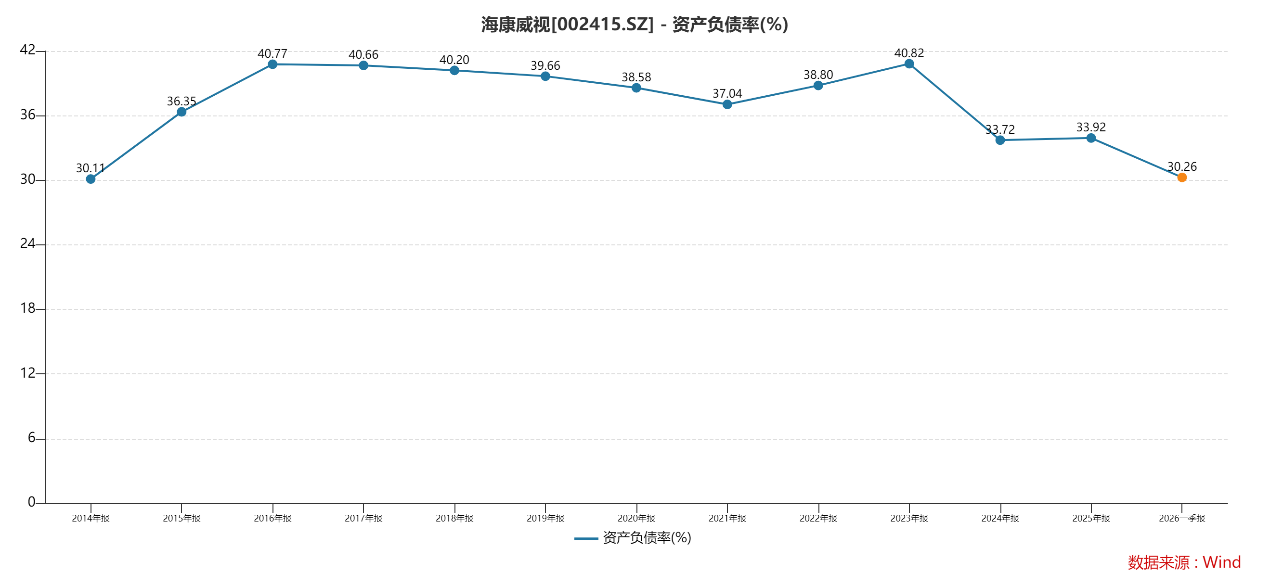 2025年,海康威视资产负债率降至33.92%,创2015年以来的新低,该数据在2026年一季度继续走低至30.26%。