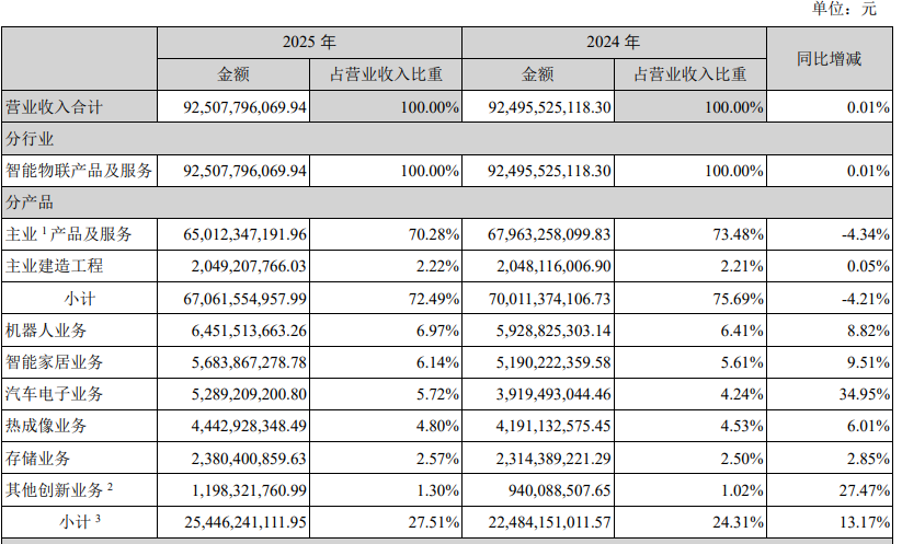 海康威视自2015年以来陆续启动海康机器人、萤石网络、海康微影、海康汽车电子、海康存储、海康消防、海康睿影与海康慧影等八个创新业务。2025年,其中7个创新业务已实现盈利,机器人业务、智能家居业务、汽车电子业务、热成像业务、存储业务增速分别为8.82%、9.51%、34.95%、6.01%、2.85%。