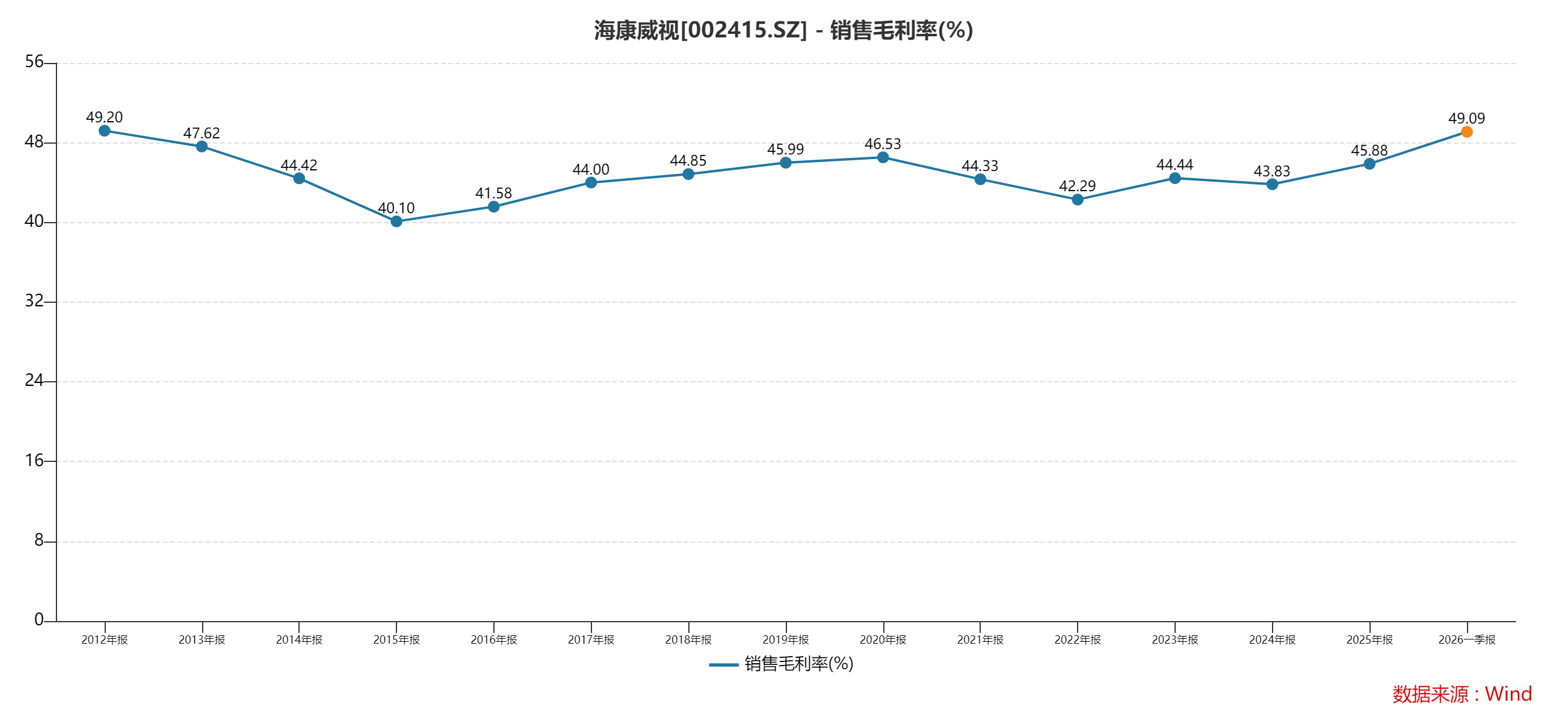 毛利率的持续改善,也是其提质战略调整的结果。该公司毛利率已连续六个季度上涨,于2025年同比增长2.05个百分点至45.88%,创2021年以来新高;到2026年一季度,公司毛利率继续提升4.16%至49.09%,拿下2020年以来的高点。