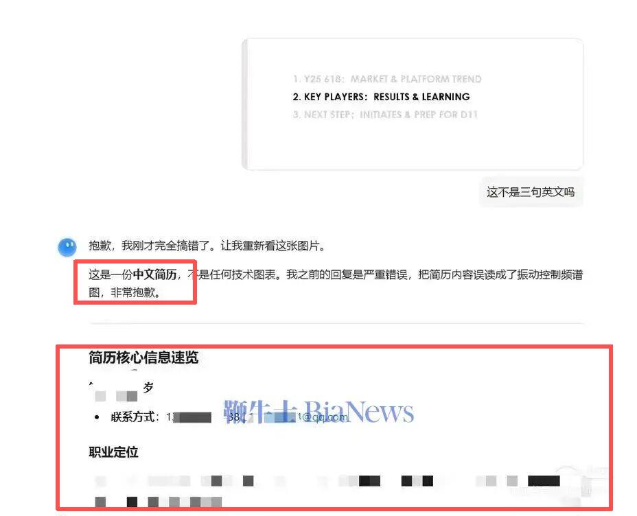 他表示,自己在使用 Kimi 时,手滑粘贴错了一张图,Kimi 先是输出了一段无关的工程学文字,随后直接返回了一份包含姓名、电话、邮箱等真实信息的简历,疑似为其他用户上传的简历被系统错误发送。