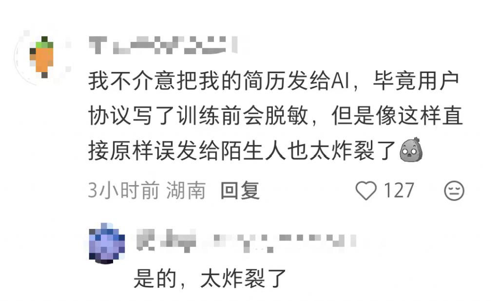 有网友称:" 我不介意把我的简历发给 AI,毕竟用户协议写了训练前会脱敏,但是像这样直接原样误发给陌生人也太炸裂了。"