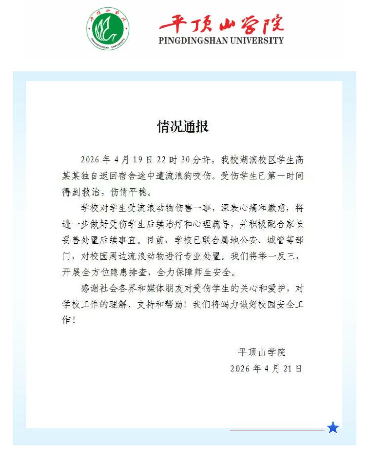 就在 21 日深夜时分,平顶山学院针对该事件发布了通报。通报称,4 月 19 日 22 时 30 分许,学校湖滨校区学生高某某独自返回宿舍途中遭流浪狗咬伤。受伤学生已第一时间得到救治,伤情平稳。学校对学生受流浪动物伤害一事,深表心痛和歉意,将进一步做好受伤学生后续治疗和心理疏导,并积极配合家长妥善处置后续事宜。目前,学校已联合属地公安、城管等部门,对校园周边流浪动物进行专业处置。学校将举一反三,开展全方位隐患排查,全力保障师生安全。