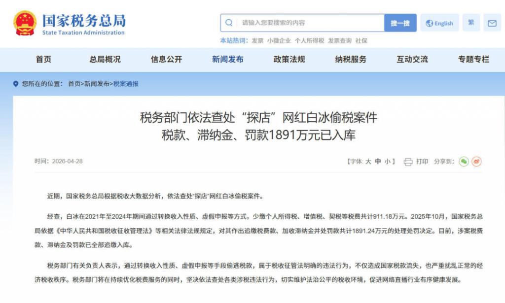 又一个千万级网红栽了,这次的主角叫白冰,偷逃税款 911.18 万元,追缴加罚款共计 1891.24 万元。