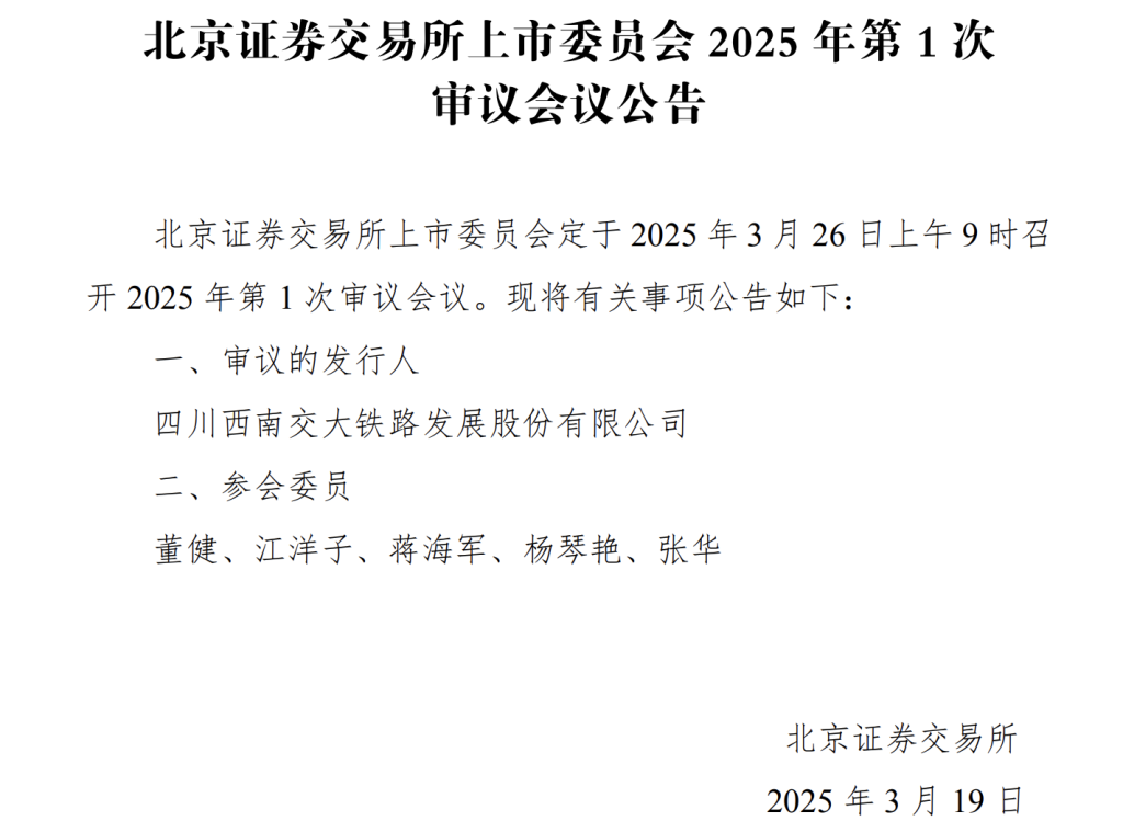 3月19日,北京证券交易所上市委员会发布公告称,定于2025年3月26日上午9时召开2025年第1次审议会议。审议的IPO为四川西南交大铁路发展股份有限公司(简称“交大铁发”)。这是北交所2025年第一家上会的IPO企业。