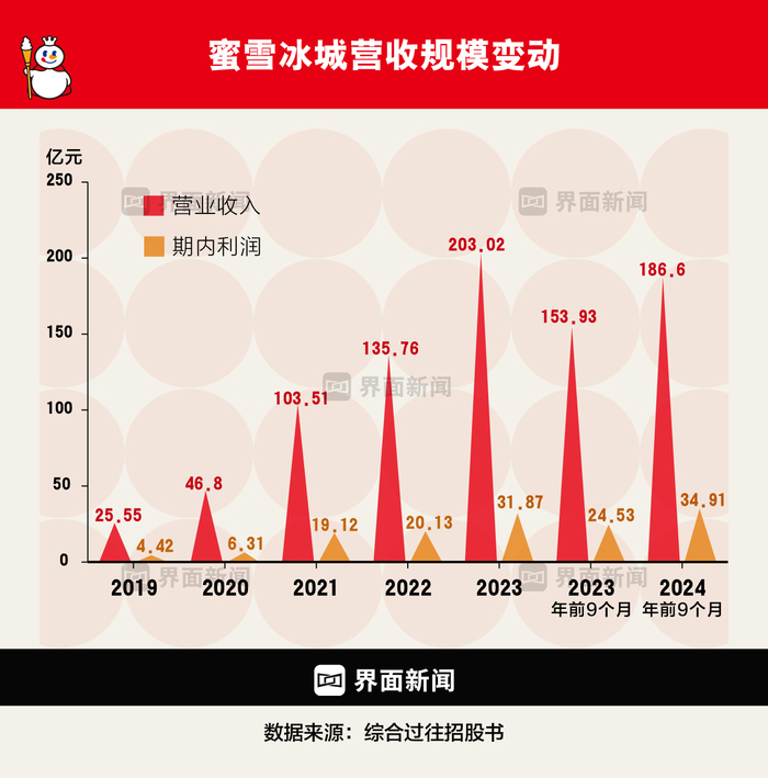 2022年及2023年,蜜雪冰城分别实现了136亿元与203亿元的营业收入;2024年前九个月,蜜雪冰城实现收入187亿元,同比增长21.2%——它是中国市场上第二个突破百亿的本土餐饮品牌。在它前面实现这个成绩的是海底捞,后来者还有瑞幸。利润方面,2024年前三季度,其毛利率和净利润率分别达32.4%和18.7%,显著高于同行。