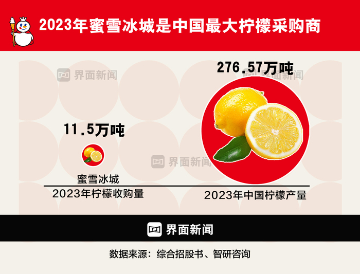 在中国最大的柠檬种植区四川安岳县,蜜雪冰城是大客户。当地果农王刚说,过去来收柠檬的收购商大多在100万斤左右,规模较大的可以冲到300万斤。“但蜜雪冰城的量远不止这些。”蜜雪冰城在招股书中称,2023年它收购的柠檬是11.5万吨。而可以参照的是,根据智研咨询,2023年中国柠檬产量在276.57万吨左右,消费量为272.87万吨。