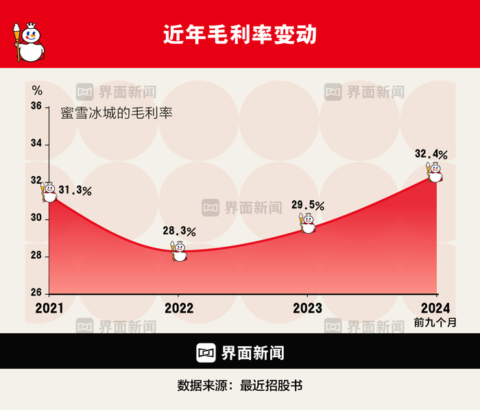 对于蜜雪冰城来说,这意味着它对供应链质量和成本结构有着足够的控制力。而这一切又在不断地改进之中。蜜雪冰城的招股书显示,其整体毛利率从2023年前九个月的29.7%,上升到24年同期的32.4%,原因是提升了供应链效率以及原材料采购成本下降。