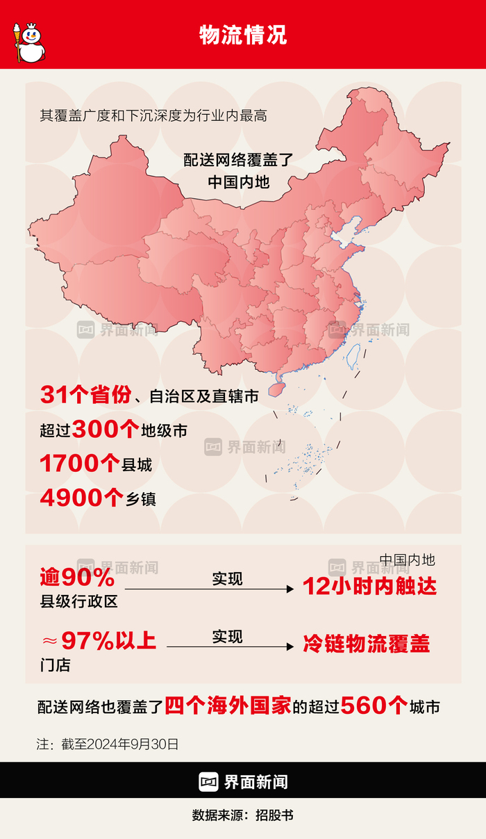 如今,蜜雪冰城在全国建有27个仓库,总面积超过35万平米。它的货车可以去往全国31个省份、自治区及直辖市、约300个地级市、1700个县城和4900个乡镇。