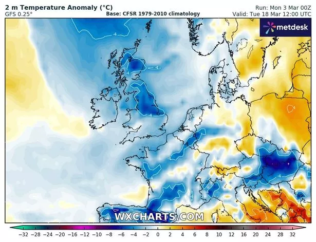 3月18日,独立天气预报公司Netweather的地图变成了红色,因为苏格兰北部几乎所有地区以及英格兰北部大部分地区的降雪风险都在增强。WXCHARTS的地图也显示了类似的情况,大约在同一时间,曼彻斯特和伯明翰等城市也出现了小雪天气。GFS对这一时期的预测显示,全国几乎所有地区的气温都将下降。