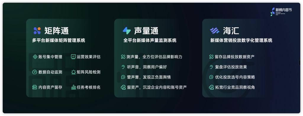 徐达内在主题为《大家Ai内容》的开场演讲中,感谢了行业同仁们十年来的支持,他表示,“新榜已成长为中国头部内容营销服务商之一。与此同时,作为一家数据驱动的内容科技公司,新榜也正在通过产品和服务帮助企业构建数字化内容资产,目前已经形成了新榜矩阵通、新榜声量通、新榜海汇三款多平台SAAS产品,分别帮助企业客户进行管矩阵账号、听社媒声音、汇投放数据”。