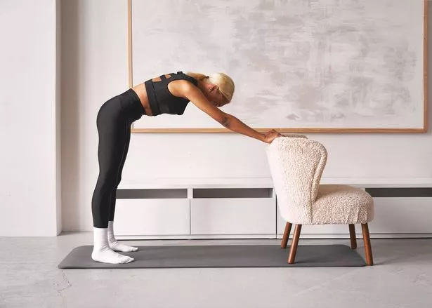 站在椅子后面,双脚与臀部同宽。将双手放在椅背上,臀部前倾,拉长脊柱。慢慢地往下滚,把头朝地面放低,膝盖稍微弯曲。让你的胸部伸展,脊柱伸展。慢慢地向上翻滚,一次一个椎体。目标是重复5到8次。
