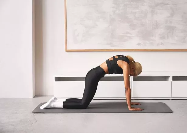 四肢着地,双手直接放在肩膀下方,膝盖放在臀部下方。当你吸气时,拱起你的背,让你的腹部向地面下沉,同时抬起你的胸部和尾骨(这是牛式)。然后,当你呼气时,转过你的背部,收起你的下巴和尾骨(这是猫式)。继续在这两个姿势之间平稳地移动,总共10个周期。