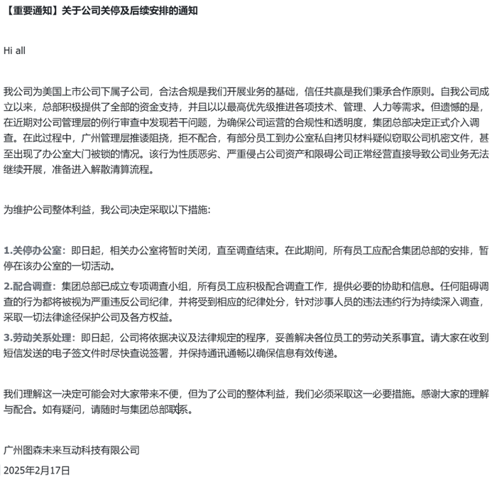 广州图森下发的通知显示,近期对公司管理层的例行审查中发现若干问题,介入调查过程中广州管理层拒不配合,“有部分员工到办公室私自拷贝材料疑似窃取公司机密文件,甚至出现了办公室大门被锁的情况。该行为性质恶劣、严重侵占公司资产和限碍公司正常经营,直接导致公司业务无法继续开展,准备进入解散清算流程。”