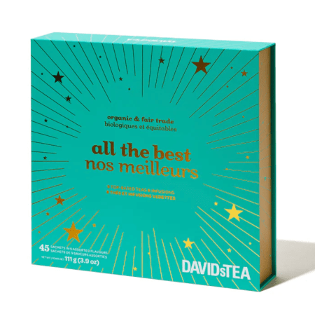 你生活中的热饮爱好者绝对会喜欢这套来自大卫茶的有机、公平贸易和顶级茶包。这套礼品包括经典的超级姜和西贡茶。为喝上最好的酒干杯。大卫茶馆51美元