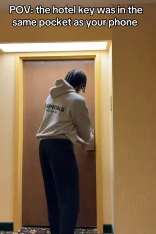 一名用户分享了自己把钥匙卡和智能手机放在同一个口袋里后被锁在酒店房间外面的经历,TikTok在网上走红。