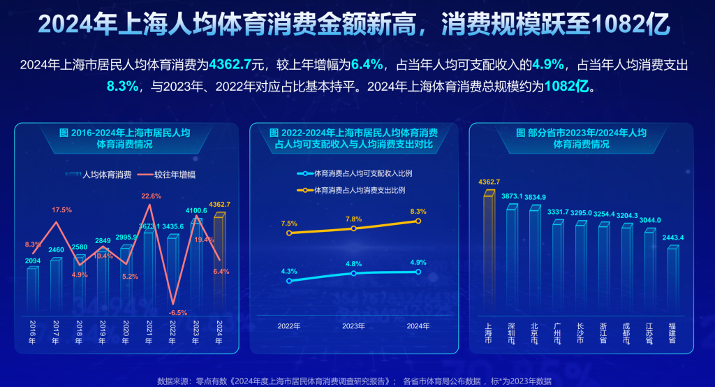28日的新闻发布会上,零点有数调查公司就受托发布了《2024年度上海居民体育消费调查报告》。报告显示,2024年上海人均体育消费达4362.7元,相较2023年增加6.4%,消费总规模约为1082亿元。
