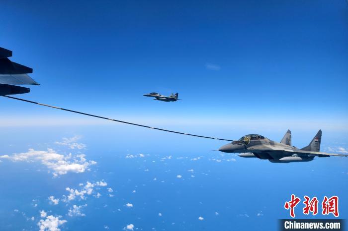4 月 28 日,参加中埃 " 文明之鹰 -2025" 空军联合训练的中国空军运油 -20 飞机和埃及空军飞机进行空中加油训练。余红春 摄