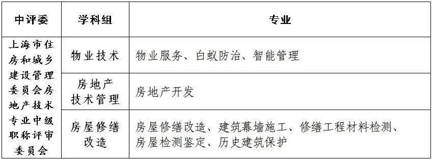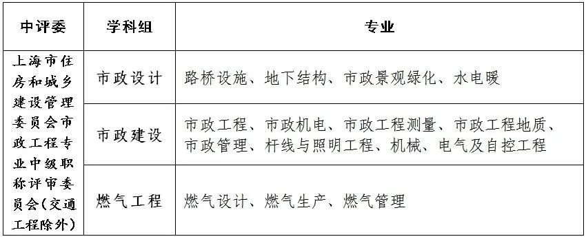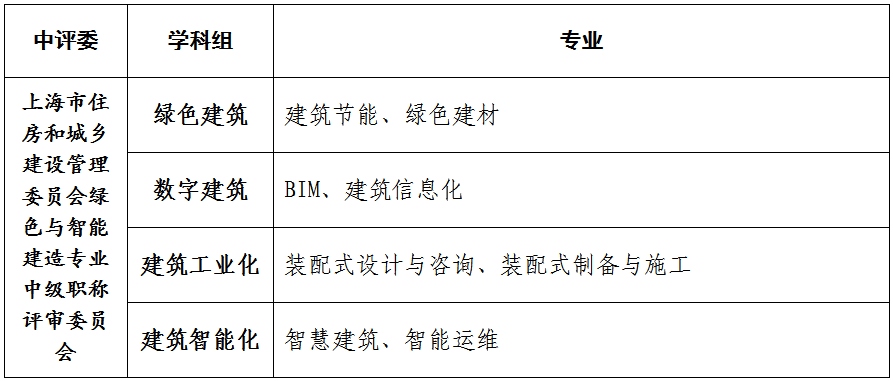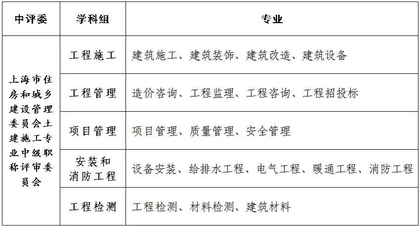 上海市住房和城乡建设管理委员会工程系列(城市与建筑设计专业、房地产技术专业、绿色与智能建造专业、市政工程专业、土建施工专业)中级职称评审委员会由上海市住房和城乡建设管理委员会组建,评委会办公室设在上海市住房和城乡建设管理委员会人才开发评价中心,下设各学科组。