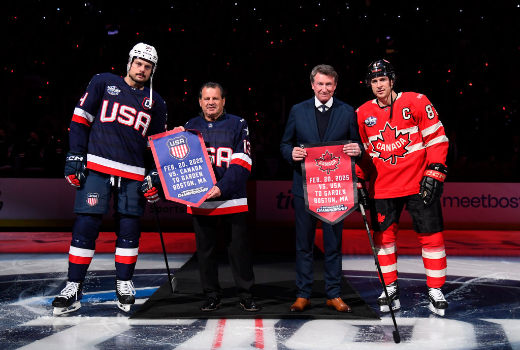 2025年2月20日,在波士顿TD花园举行的加拿大队和美国队的4国冠军赛前的赛前仪式上,美国队34号的奥斯顿·马修斯、美国队荣誉队长迈克·埃鲁齐奥内、加拿大队的韦恩·格雷茨基和加拿大队的西德尼·克罗斯比在中央冰上合影。布赖恩·巴比诺/4NFO/冰球世界杯通过盖蒂图片社