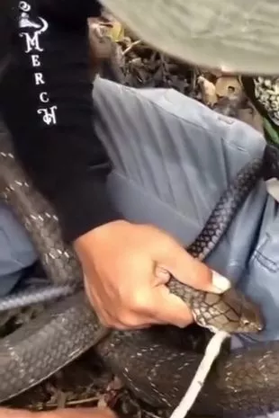 这名受害者坐在森林里的地上,做着鬼脸,这只大型爬行动物穿过他的裤子啃着他的腹股沟。一位朋友帮他把一根棍子插进蛇嘴里,往它头上浇水,但这条爬行动物拒绝动弹。