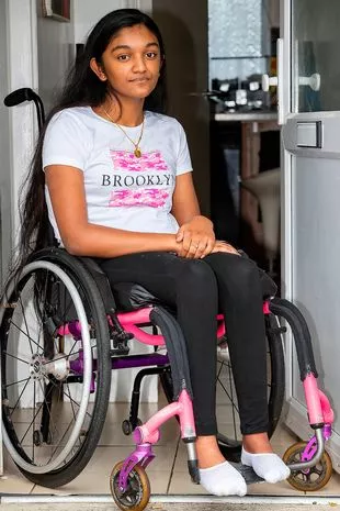 她说:“我可以扶着架子站起来,但我的脊椎不够强壮,支撑不了我。”“我现在和轮椅在一起真的很平静,它是我今天的一部分。”