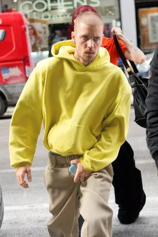 贾斯汀·比伯被看到留着平头,穿着黄色卫衣,但粉丝们忍不住注意到他凹陷的眼睛(图片:GC图片)