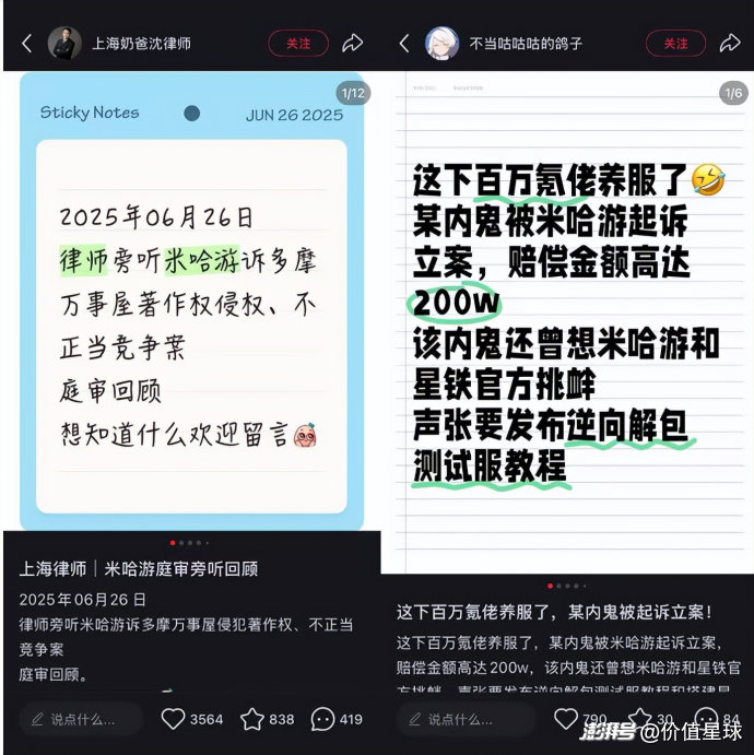除了内容本身的“新”,在场外的二游厂商也有了不少新动作。叠纸联手X11以“暖暖”为创作灵感推出了DearNikki系列盲盒,首发卖出了400多万销量;米哈游则加紧了“律师函”出击的速度,不仅将泄露未来版本数据的解包佬告上法庭,还顺手把靠同人创作盈利的多摩万事屋告了——诉其不正当竞争、侵犯著作权,据说庭审当天旁听席坐得满满当当,超50人到场旁听,庭外还有不少玩家站脚助威。