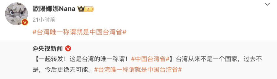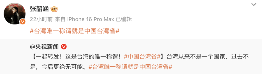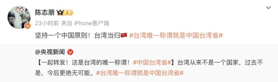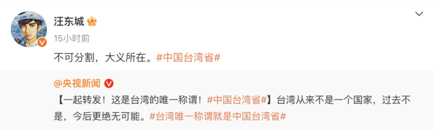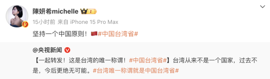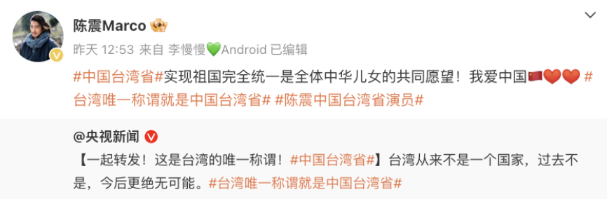 此后,更引发众多台湾艺人,带#中国台湾省话题转发,表达对中华儿女身份的认同。