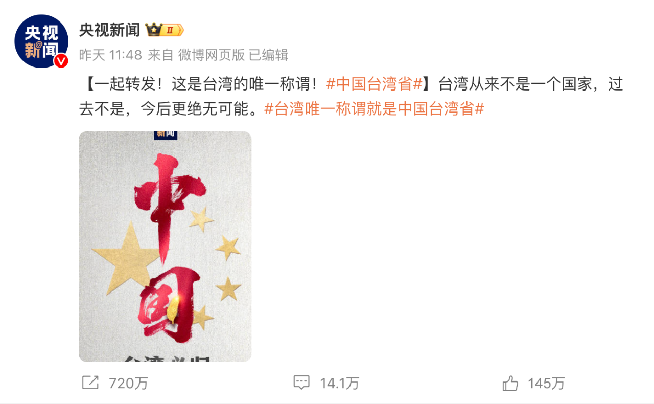 当日,@央视新闻 发布海报,以中国二字、五星和台湾岛作为设计主体,配合“台湾必归”的文案,引发全网刷屏!